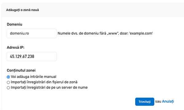 Log in to your client account at https://my.host-age.ro and add the domain under Other Services as shown in the image below, using the IP provided by your site hosting provider. In this example, we used IP 45.129.67.238.