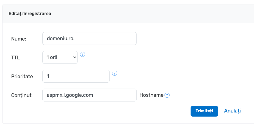 On the next page add the entry aspmx.l.google.com to the Content field and set the Priority to 1. Then click the Submit button.