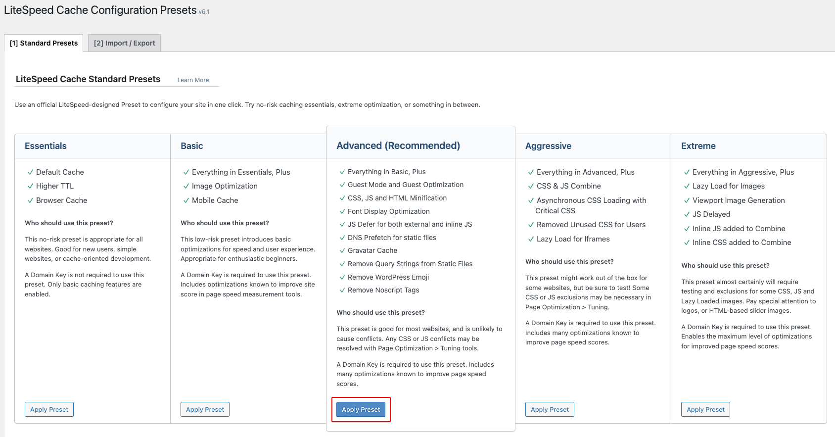 We recommend using the Advanced preset. Click Apply Preset.