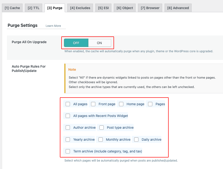 From the menu, choose the Cache section. Now click the [3] Purge tab and set the Purge All On Upgrade option to Off, and uncheck all options under Auto Purge Rules For Publish/Update. You can adjust these options according to your site. If you publish articles daily and they appear on the homepage, check Home page and/or All pages with Recent Posts Widget.