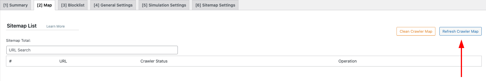 Click the [2] Map tab and press the Refresh Crawler Map button to import the list of pages from the site.